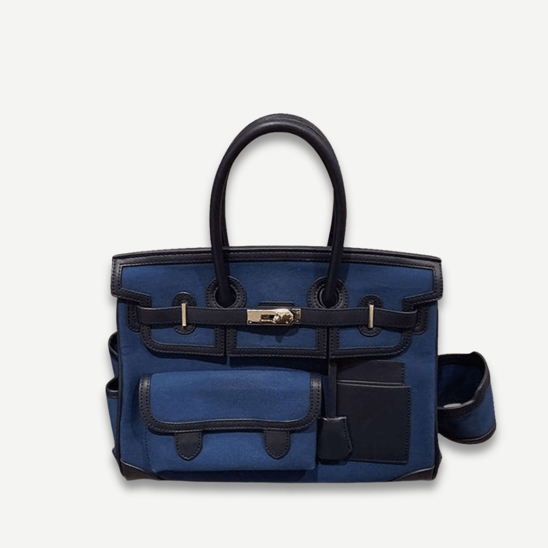 A suede tote crafted with the globe-trotter in mind. Luxurious leather detailing frames the sturdy yet chic silhouette, complete with plenty of external pockets and pouches, including a specially designed drink holder. Carry it along for an unparalleled journey of discovery.